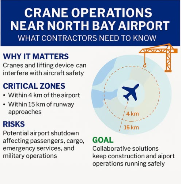 Cranes and tall equipment can affect aircraft flight paths or circuit patterns around the airport.