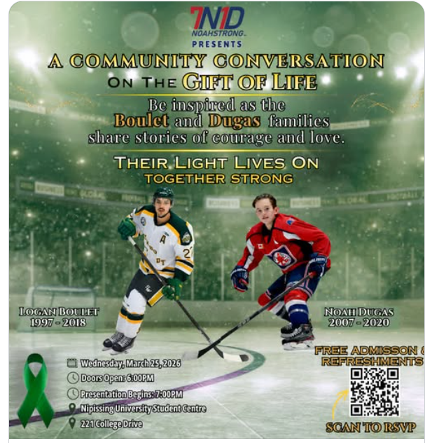 Our community will be honoured to welcome Toby and Bernadine Boulet, parents of the late Logan Boulet as they visit the North Bay, March 24-27th 2026, to share a powerful message of hope, compassion, and the life-saving impact of organ donation.