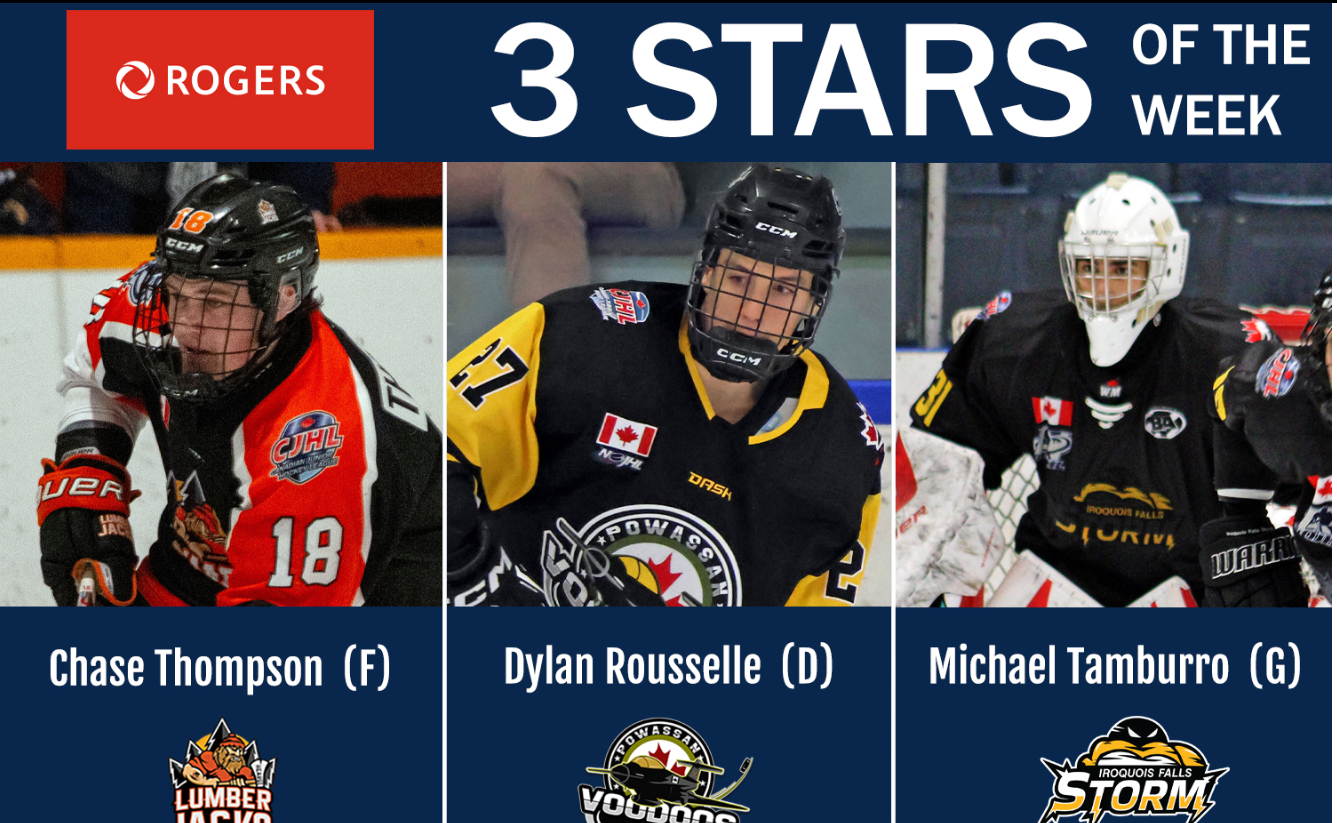 The Northern Ontario Junior Hockey League (NOJHL) announced Monday that forward Chase Thompson (Hearst Lumberjacks); defenceman Dylan Rousselle (Powassan Voodoos) and goaltender Michael Tamburro (Iroquois Falls Storm) have been named its Rogers 3 Stars of the Week for the period ending December 14.