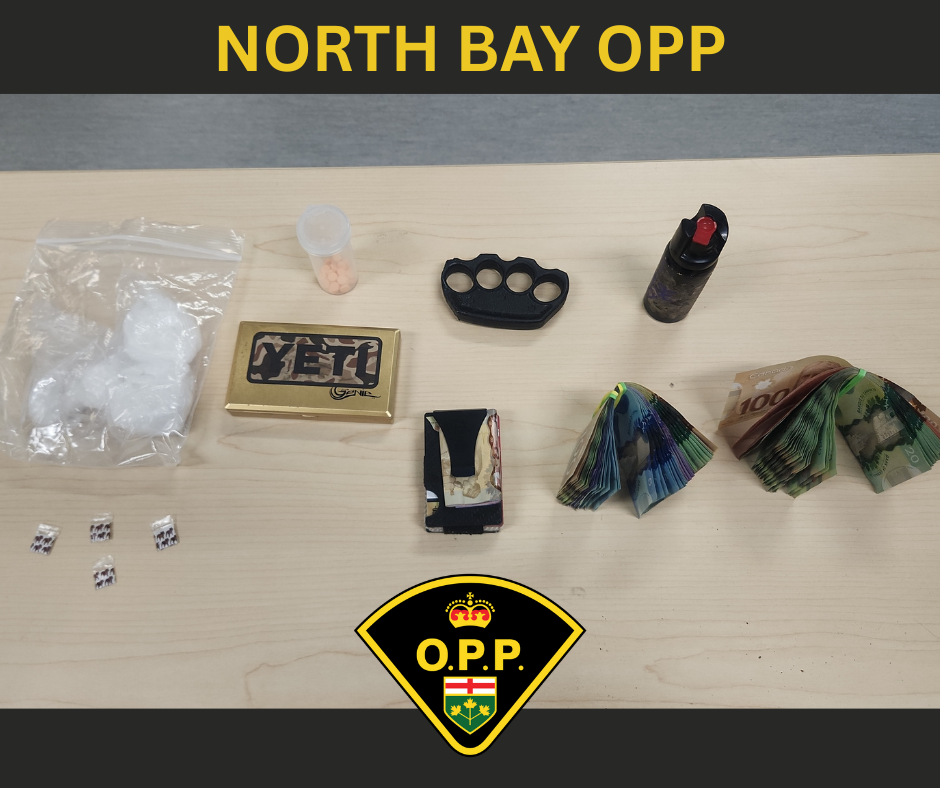 A search resulted in police seizing suspected clonazepam pills, crystal methamphetamine, brass knuckles, bear spray, a large quantity of Canadian currency, and more.