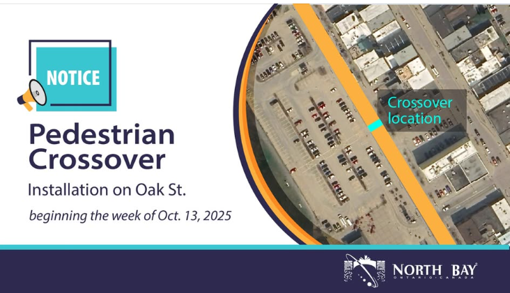 The City of North Bay is advising the public that construction of a new Pedestrian Crossover on Oak Street, between Fraser and Ferguson Streets, is expected to begin next week.