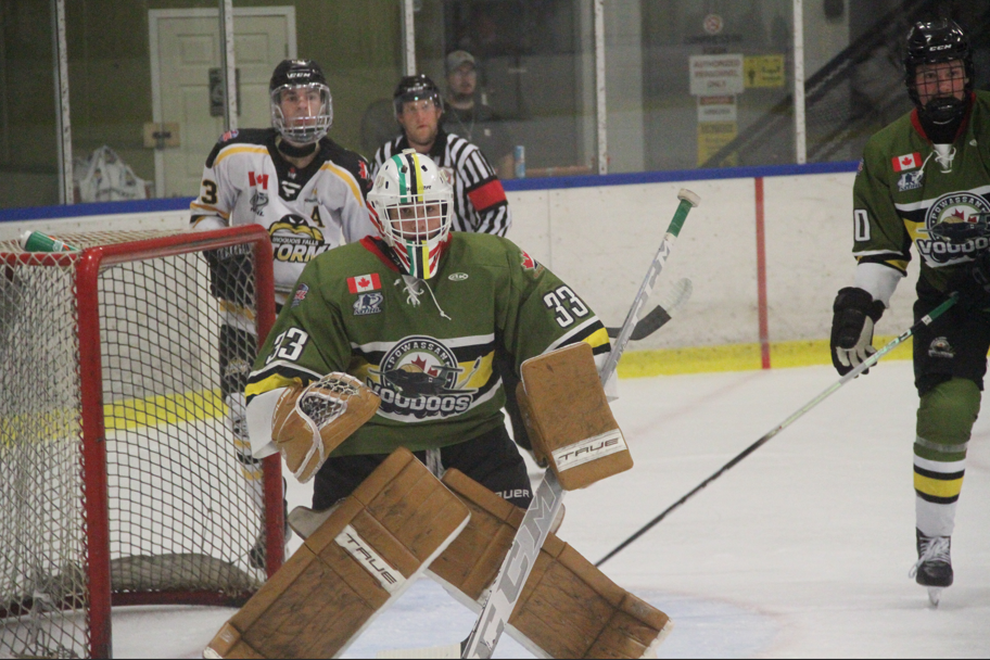 Continuing to press, the Voodoos extended their cushion early in the second on a five-on-three that saw Anthony Boyes whack in a feed through the crease in eluding Alex Hall who had entered in relief for Iroquois Falls.