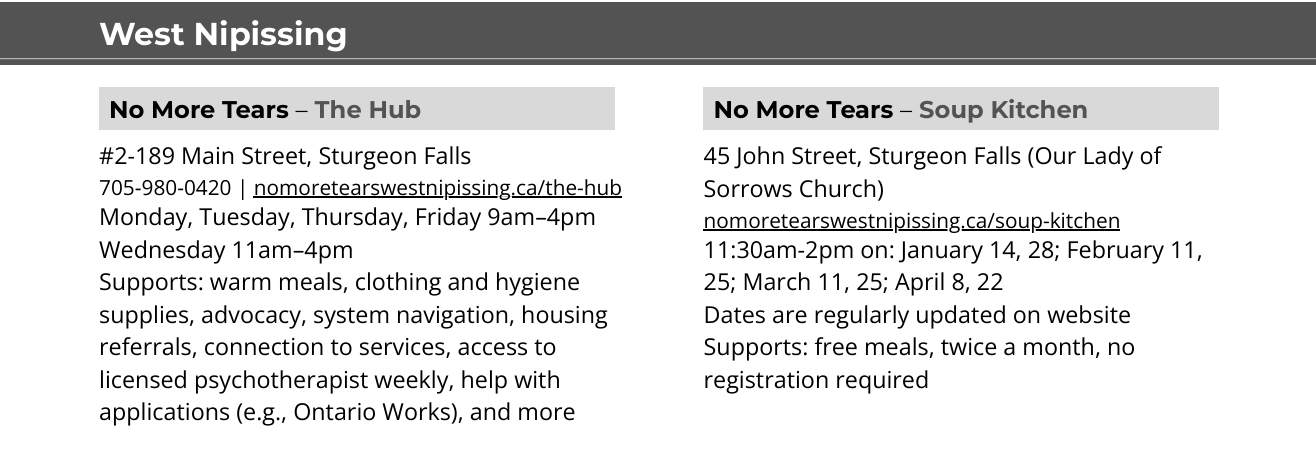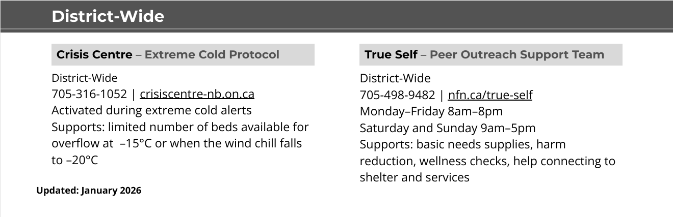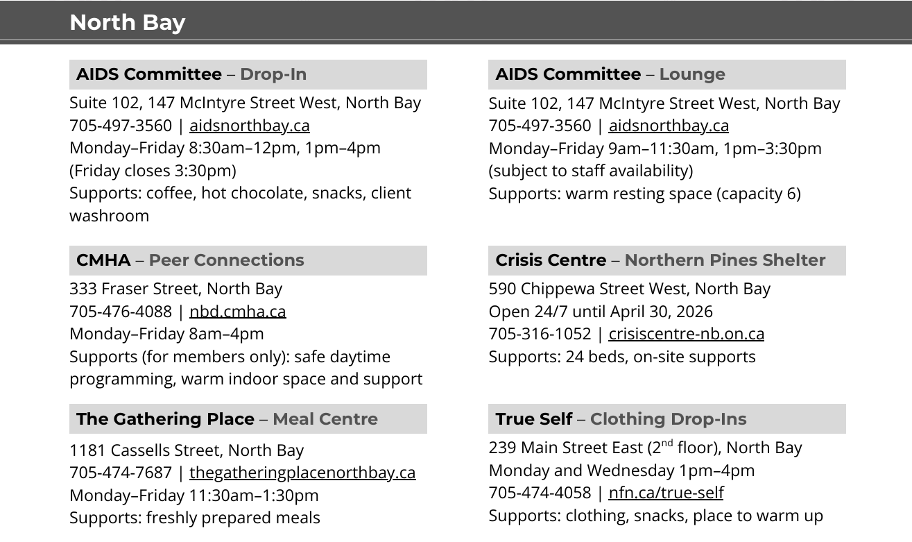 Daytime spaces, meals, outreach, and other supports are offered across the District of Nipissing this winter. Hours may change. Please confirm with each provider.