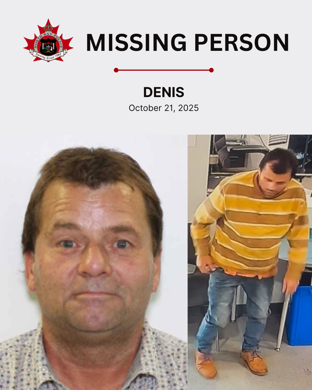 The North Bay Police Service is seeking the public’s assistance in locating Denis, a 60-year-old male who has been reported missing.